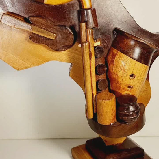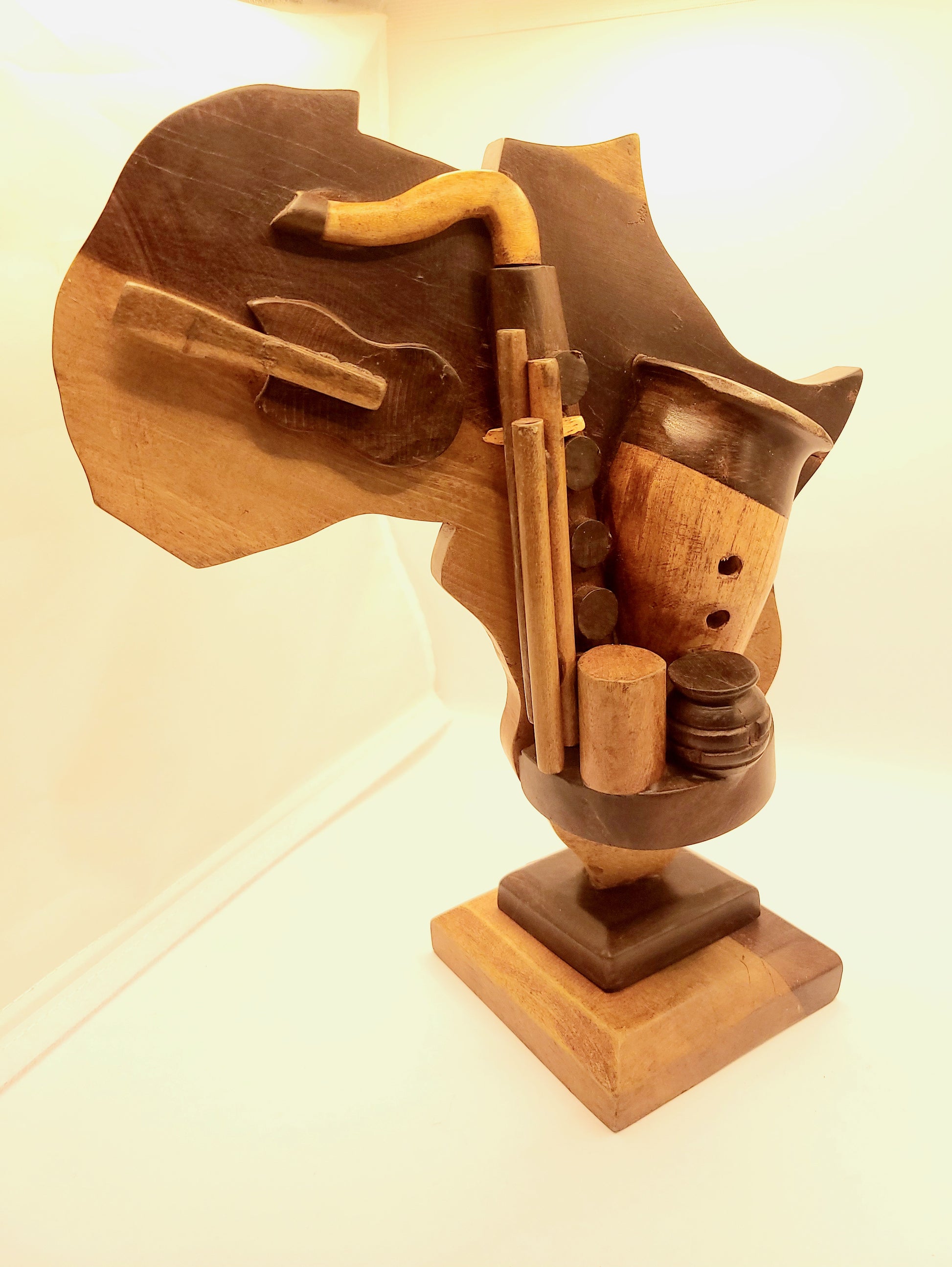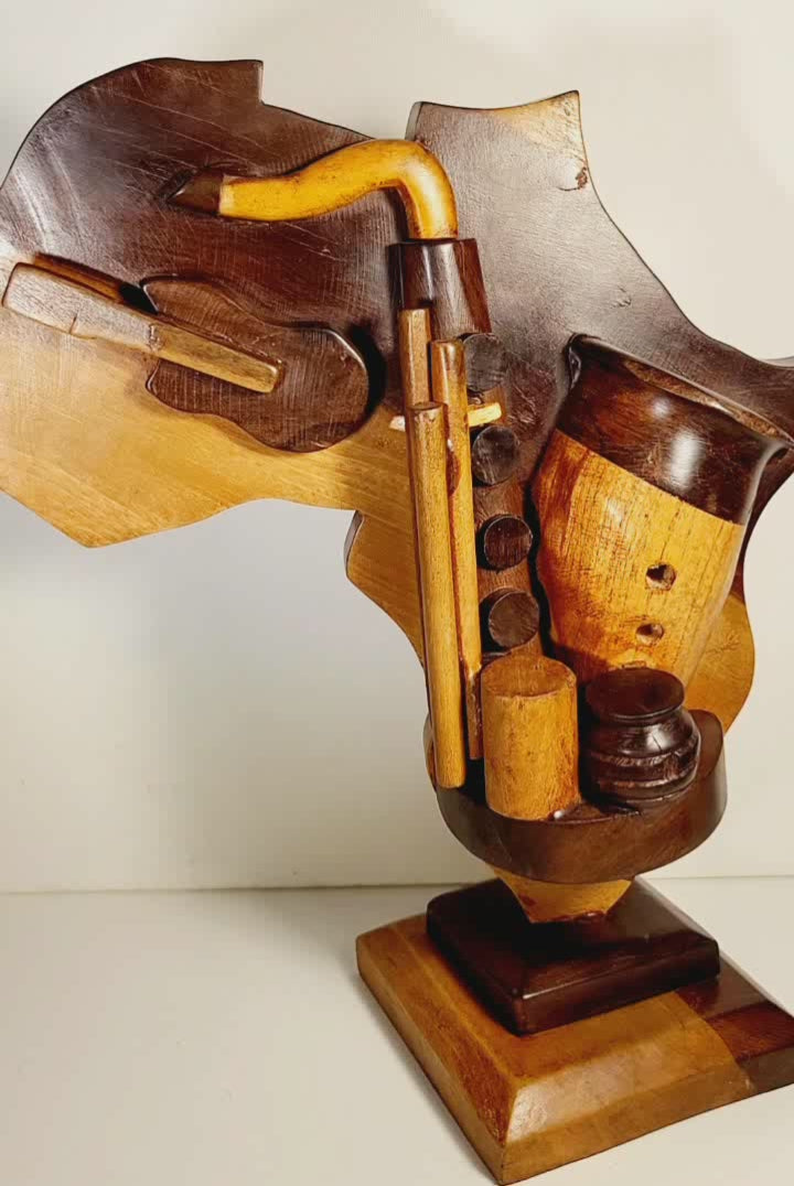 This is a combo of Africa map with musical instruments done in Rosewood. It is a depiction of the importance of music, as well as the the importance particular instruments played in the creation of the modern Africa.